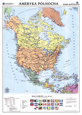 Mapa dwustronna, foliowana, do ćwiczeń (można na niej pisać) Dwustronna foliowana mapa polityczna Ameryki Północnej. Bogata kolorystyka mapy sprawia, że podział polityczny kontynentu jest bardzo wyrazisty. Mapa wzbogacona jest o flagi państw Ameryki Północnej. Druga strona przedstawia konturową mapę polityczną, doskonałą pomoc dydaktyczną do lekcji powtórzeniowych.