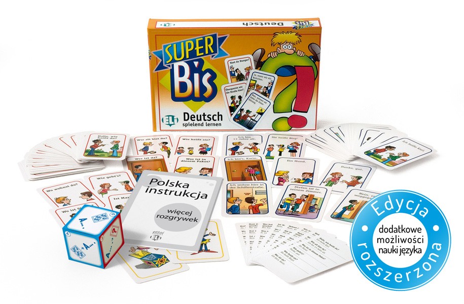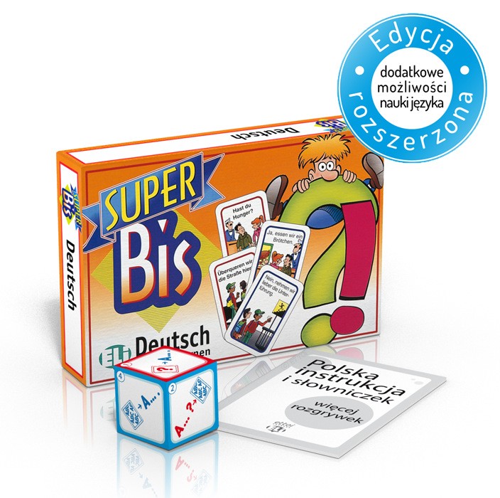 Super Bis - Deutsch jest grą językową rozwijającą umiejętność zadawania pytań oraz udzielania odpowiedzi w języku niemieckim związanych z prostymi sytuacjami życia codziennego.