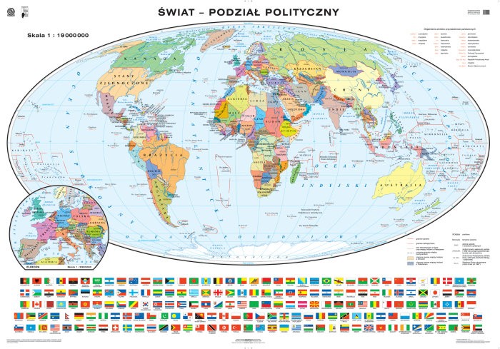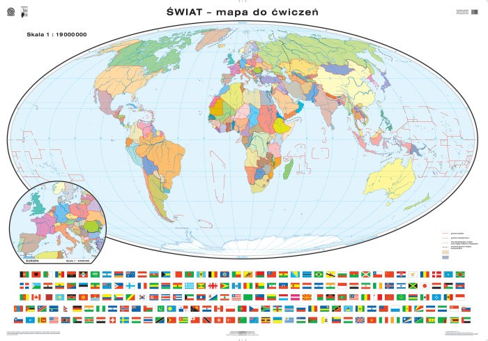 Na jednej stronie znajduje się mapa w skali 1:19 000 000 ukazująca podział polityczny świata. Ponadto w większej skali (1:9 500 000) zaprezentowano podział polityczny Europy. Dodatkowo przedstawiono flagi poszczególnych państw.